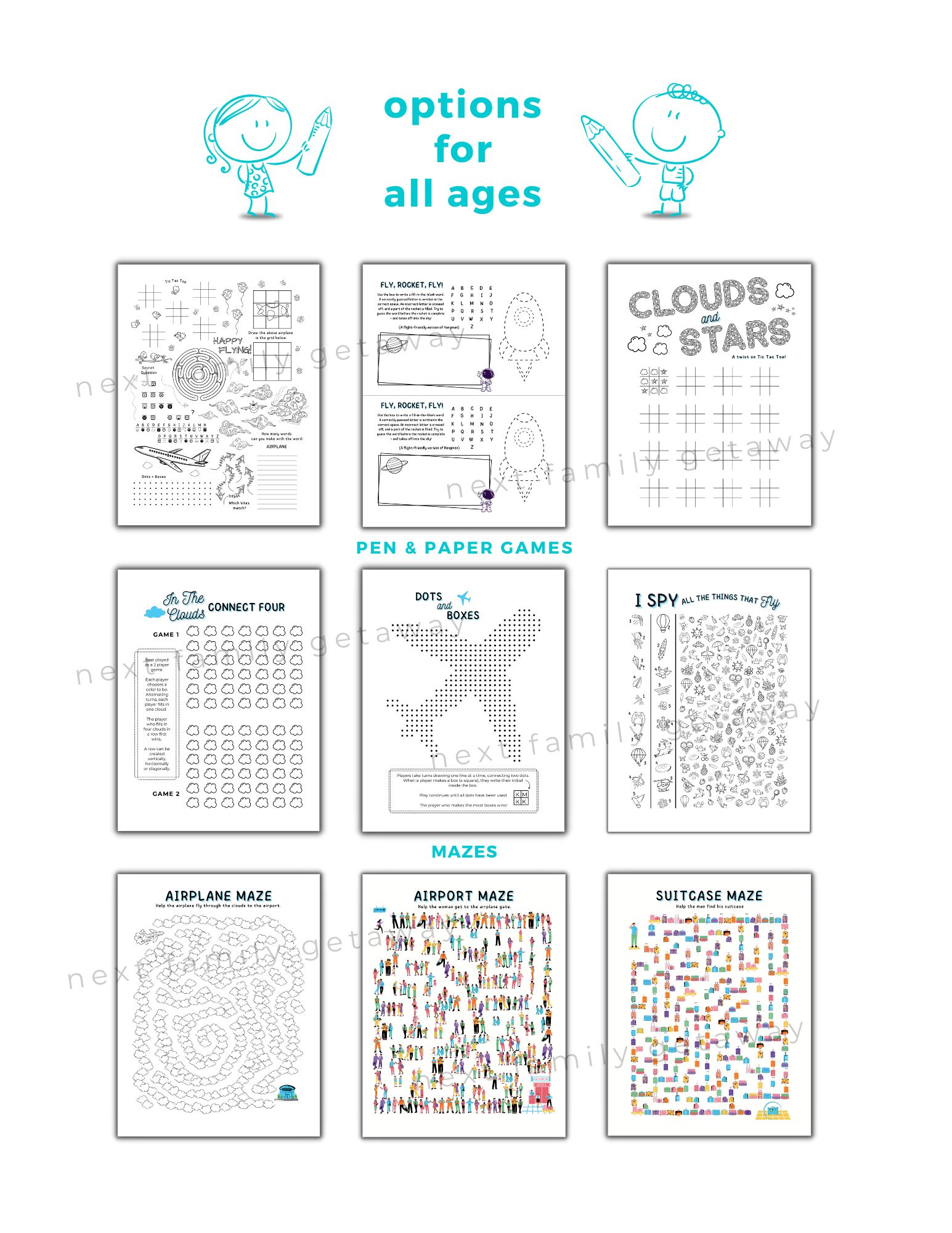 - 3 x Mazes: Airplane Maze, Airport Maze, and Suitcase Maze
